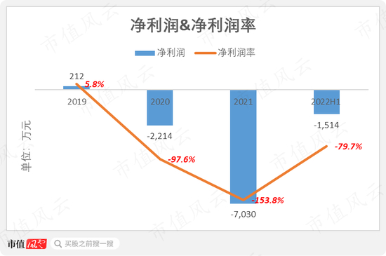 公司的净利润自2020年起由正转负。2021年,公司净利润-7,030万元,对应净利润率-154%。