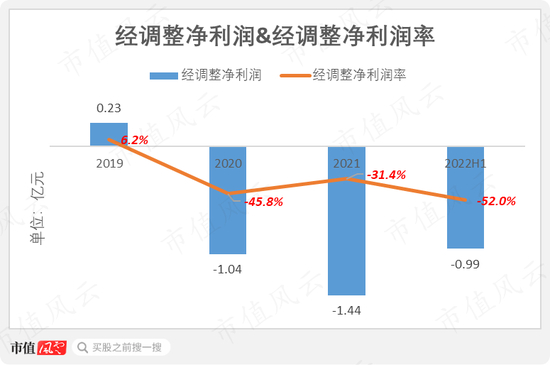 2021年,公司经调整净利润-1.4亿元,对应经调整净利润率为-31%。2022年上半年,经调整净利润率恶化至-52%。