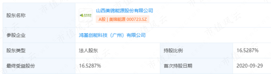 美锦能源在里面同样扮演了重要角色。企查查显示,美锦能源对鸿基创能持股16.53%,首次持股日期为2020年。