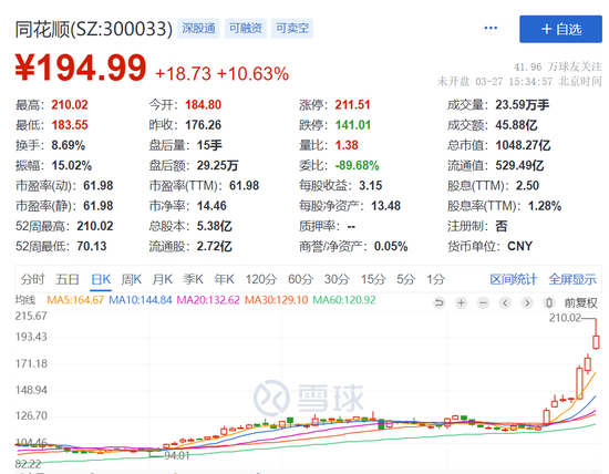 3月27日,截至收盘,同花顺涨超10%,报194.99元,成交额45.88亿元,换手率8.69%。3月16日以来,该股股价持续上涨,已累计涨超66%。
