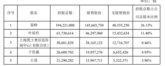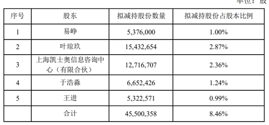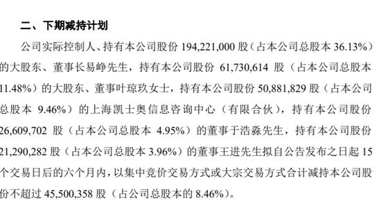 公告显示:实控人、董事长易峥、董事叶琼玖,凯士奥、于浩淼、王进拟自公告发布之日起15个交易日后的六个月内,以集中竞价交易方式或大宗交易方式合计减持本公司股份不超过45,500,358股(占公司总股本的8.46%)。
