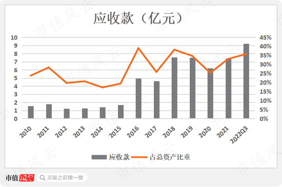 因业务性质,公司应收款(包括应收票据、应收账款、应收保费)激增。截至2022年9月底,应收款达9.2亿,占总资产比重26%。