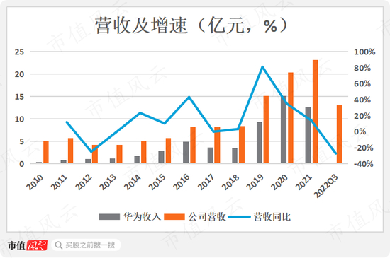 2010年上市以来,公司很长一段时间处于躺平状态,营收规模变动不大。2019年,在华为的带动下业绩大增,并在2021年达到23.2亿的历史新高。