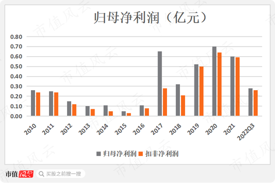 归母净利润则是从2017年开始明显增长,但直至2021年也仅0.59亿。2022年预计盈利0.23亿-0.34亿,同比下降44%-62%。