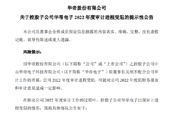 进入年报披露季,各上市公司都在密锣紧鼓进行2022年年报收尾工作,但知名电器上市公司华帝股份却公告称因原董秘吴刚不配合公司审计工作的开展,导致公司2022年审计进程受阻。