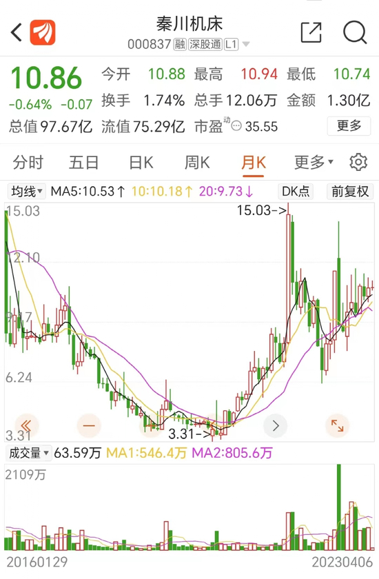 截止记者发稿,秦川机床总市值为97.67亿元,股价为10.86元。