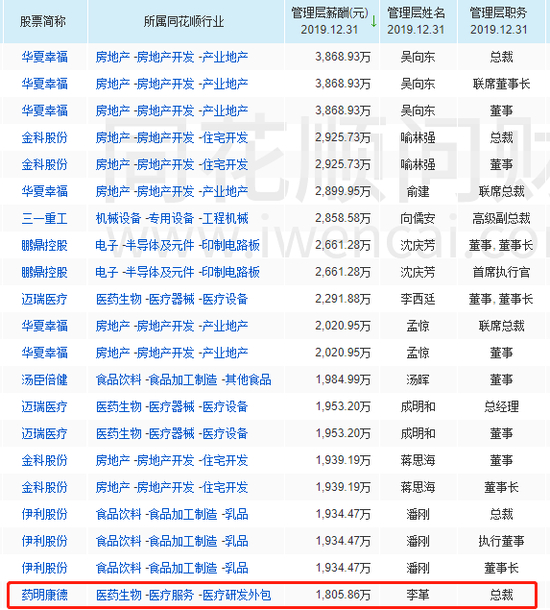 2019年,李革的薪酬上涨至1805.86万元,但排名出现下滑出前十。房地产行业大爆发,华夏幸福总裁吴向东以3868.93万元居首,金科股份总裁喻林强2925.73万元次之。