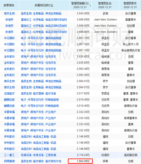 此外,华夏幸福的联席总裁俞建、三一重工高级副总裁向儒安都在2800万元之上,高于李革1000万元。