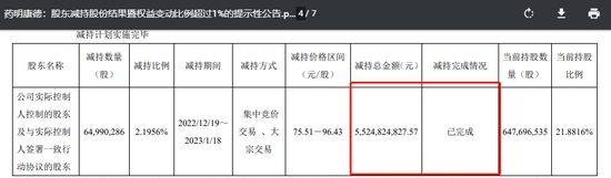 2023年1月,药明康德又公告,实控人控制的股东及与实控人签署一致行动协议的股东在2022年12月19日至2023年1月18日,减持了将近6500万股,套现约55亿元。
