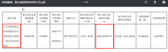 2022年9月,药明康德公告股东减持结果,实控人控制的股东及与实控人签署一致行动协议的股东减持合计22.05亿元。