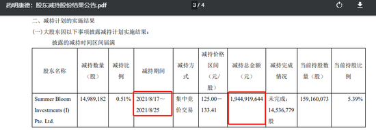 根据股东减持结果公告,2021年8月17日至25日,短短8天时间,重要股东Summer BloomInvestments Pte. Ltd.套现19.45亿元。