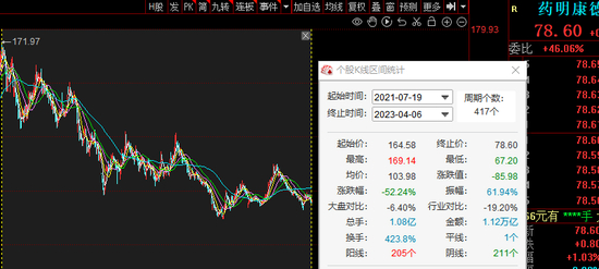 同花顺显示,2018年5月至2021年7月,药明康德股价持续上涨,涨幅高达16倍,总市值一度高达5000亿元。4月6日收盘,药明康德报价78.6元,总市值2332亿元。