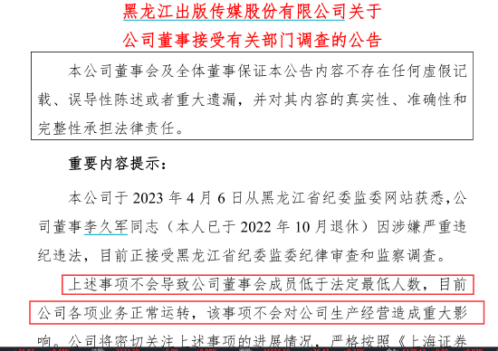 刚刚,龙版传媒发布公告表示,上述事项不会导致公司董事会成员低于法定最低人数,目前公司各项业务正常运转,该事项不会对公司生产经营造成重大影 响。