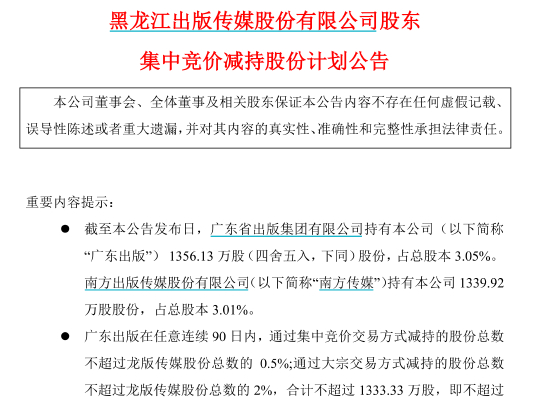无独有偶,4月6日,第三大股东广东省出版集团和第四大股东南方传媒纷纷表示,两家合计减持不超过1778万股龙版传媒。