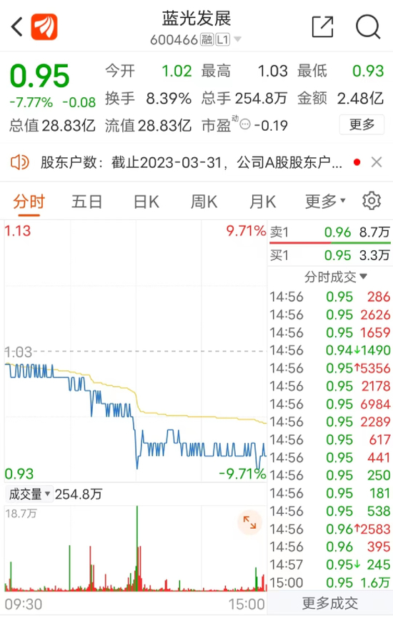 6日早盘,蓝光发展就在前一日收盘价1.03元基础上以1.02元低开,随后很快探低1.01元,到10点半,探低1元,10:49探低0.98元,最终失守1元关口。失守之后空方势如破竹,到下午刚开盘蓝光发展跌幅已近9%,股价来到0.94元,收盘则最终定格在0.95元,跌幅7.77%。就这样,蓝光发展收盘价首次低于面值(即1元)。