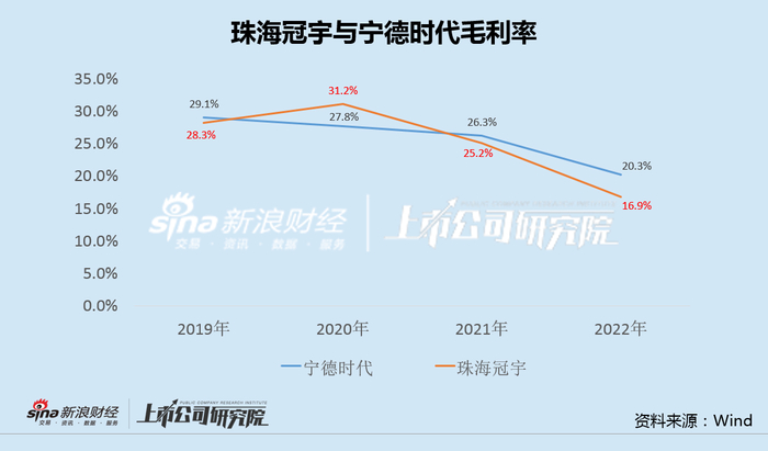 2022年,珠海冠宇整体毛利率降至16.9%,呈现加速下行走势,转型动力和储能锂电后,产品竞争力和成本控制能力备受市场质疑。