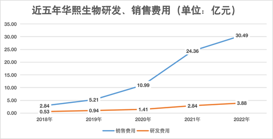 同时在增长的还有研发成本。2022年,华熙生物研发投入3.88亿元,研发人员增加了256人,目前一共有827人。不过,在高企的销售费用面前,研发投入只是一个小零头,并且两者差距不断拉大。2018年,华熙生物销售费用为研发费用的5.36倍,但在2022年,差距已经拉大到7.86倍。