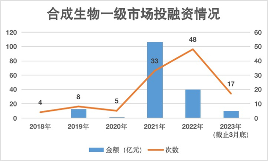 资本对合成生物的热情在过去一年有所冷却,根据公开信息,2021年一级市场融资金额106亿元,达到顶峰之后,2022年呈现疲软态势,虽然投融资次数增加,但是投融资金额骤降62.47%。
