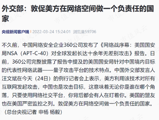 2022年3月,公司率先公开披露了美国国家安全局(NSA)针对中国境内目标所使用的代表性网络武器——Quantum(量子)攻击平台,并得到外交部的引用。