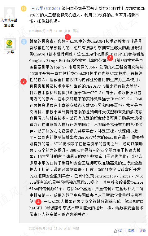 2月2日,有股民在上证e互动平台提问:三六零是否有在360软件上增加类似ChatGPT的人工智能聊天机器人的计划?