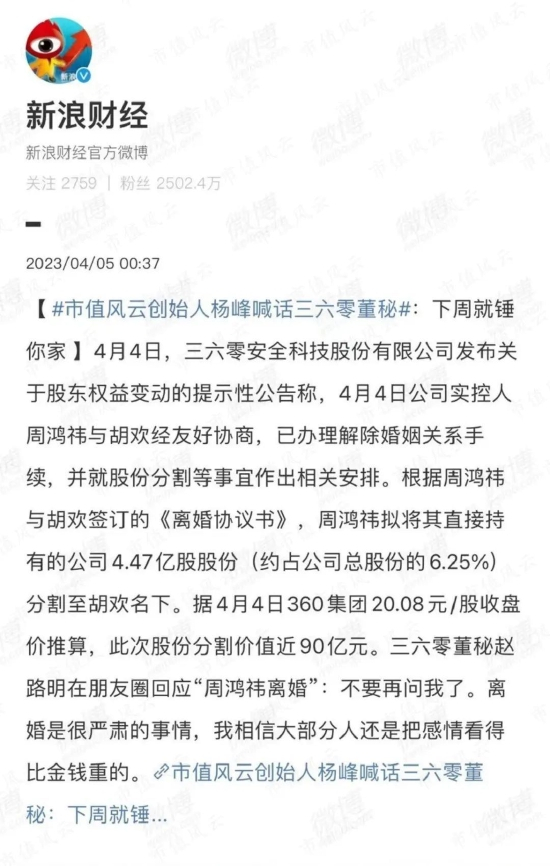 根据该公告,三六零实控人周鸿祎与妻子胡欢于4月4日签订离婚协议,周鸿祎将其持有的三六零6.25%股权分割至前妻胡欢名下。