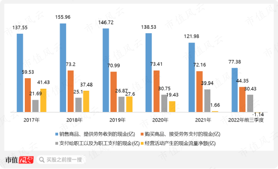 直观结果就是造血能力持续萎缩:2021年勉勉强强收支平衡,2022年前三季度净流出1.14亿。