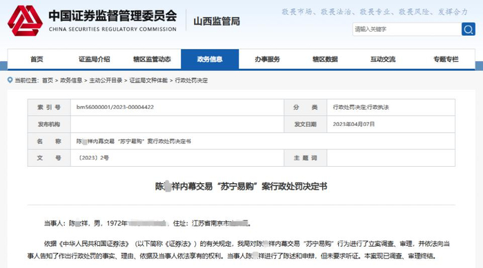 日前,山西证监局公布的一份行政处罚决定书显示,2021年苏宁易购股东研究转让股份并引入国资股东之际,时任苏宁置业副总裁的丈夫陈某祥获知内幕信息,通过他人账户大举买入,短短半个月时间即获利超51万元。