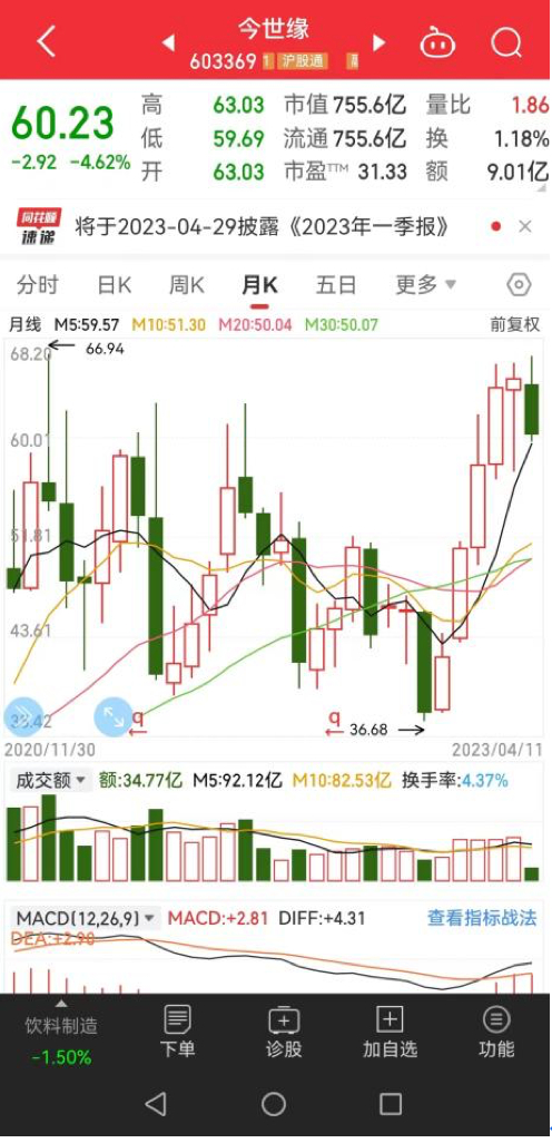 且不论这些预测的合理性如何,今世缘股东上海铭大实业(集团)有限公司用实际行动实现了高位减持套现,在去年12月8日至今年3月15日这一波凌厉的上涨过程中,该公司成功套现10.60亿元,减持均价约为53.58元/股。