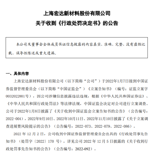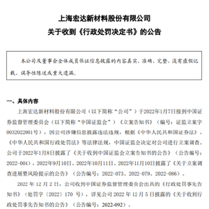 公告显示,ST宏达未按规定披露实际控制人,连续两年年报虚增收入和利润超8亿元、年度报告虚假记载,公司及相关高管被证监会处以逾1500万元罚款。