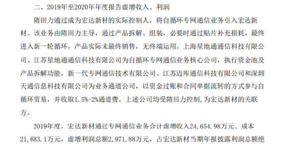 隋田力通过成为宏达新材的实际控制人,将自循环专网通信业务引入宏达新材。该业务由隋田力主导,通过产品拆解、组装,必要时通过贴片补充损耗,最终进入新一轮循环,产品实际未最终销售,无终端运用。2019年度,ST宏达通过专网通信业务合计虚增收入近2.5亿元、成本近2.2亿元,虚增利润总额2971.88万元,占ST宏达当期年报披露利润总额绝对值的38.93%;2020年度,ST宏达通过专网通信业务合计虚增收入近4.89亿元、成本近3.86亿元,虚增利润总额1.03亿元,占ST宏达当期年报披露利润总额的146.09%(占更正后利润总额151.08%)。证监会指出,ST宏达上述行为导致《2019年年度报告》和《2020年年度报告》构成虚假记载。