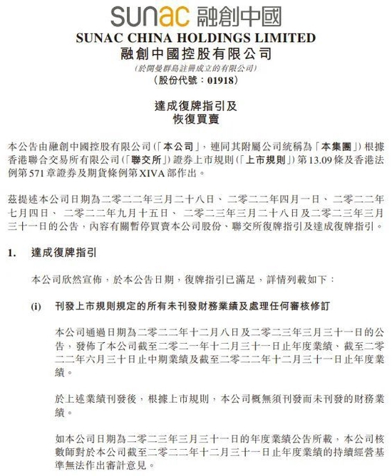公告表示,公司已达成港交所复牌指引所需的要求。融创相继发布了截至2021年12月31日止年度业绩、截至2022年6月30日止中期业绩及截至2022年12月31日止年度业绩。上市规则规定的所有财务业绩均已完成刊发。