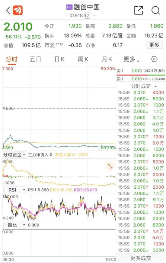 今日开盘,融创中国股价跌去近六成,刷新了2017年2月以来新低,截至收盘跌幅56.11%,报2.01港元/股。停牌前,融创中国股价为4.58港元/股。