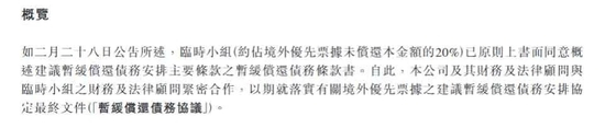 此前,公司已于2022年底率先完成了160亿元境内公开债重组工作,2023年3月28日公布境外债务重组方案并获得境外债权人小组支持。