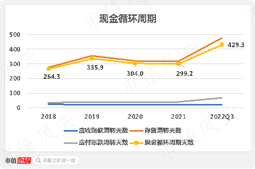 由于公司的货常年在仓库里吃灰,存货周转天数居高不下,2022年前三季度更是上升至475天,相应的现金循环周期天数自然也是在高位徘徊,同期高达430天,压力很大。