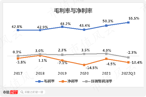过去五年,公司综合毛利率小幅上升,从2017年的42.8%增长至2022年前三季度的55.5%,但经调整利润率却常年在3%左右。