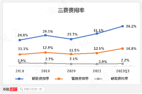 公司的经营模式,导致其销售费用率畸高,2022年前三季度高达38.2%。一方面可以看出公司产品缺乏竞争能力;另一方面,公司线下48家直营店中,有47家物业是靠租赁,房屋租赁费用很大。