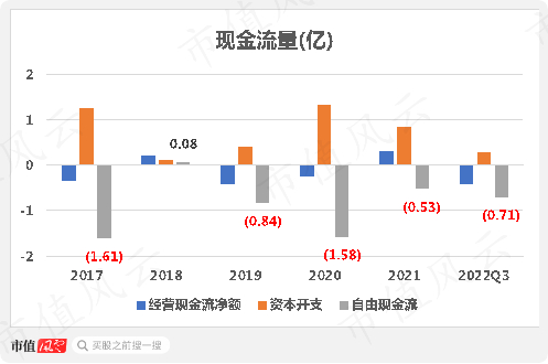 业绩拉垮,经营性现金流净额也是常年为负,2017-22年前三个季度累计为-9500万,同期支出4.2亿资本开支,最终自由现金流净流出5.1亿,属于只出不进,赚不到铜板。