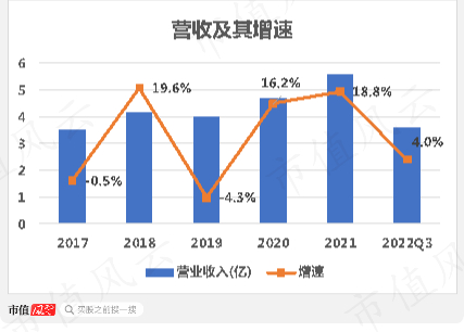 与公司营收比,盈利能力更是不堪入目。2017-21年,公司营收从3.5亿增长至5.5亿,CAGR为12.1%。公司预告2022年营收为5.5亿-6.1亿,基本与去年持平。