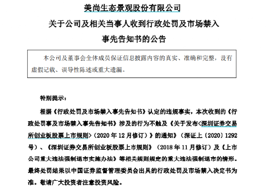 就在一周前,4月11日凌晨,美尚生态公布被证监会下发行政处罚及市场禁入事先告知书的消息。按照当前的监管处理结果,美尚生态拟被罚款千万。