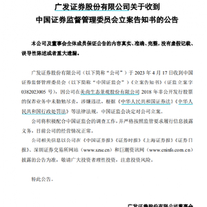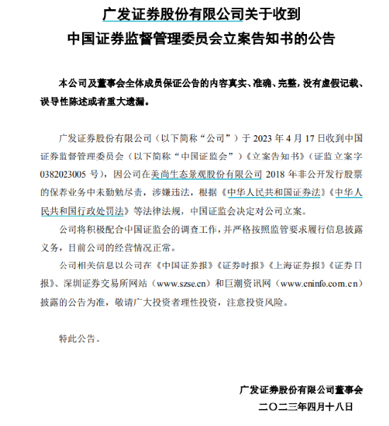 据广发证券公告称,其于2023年4月17日收到中国证券监督管理委员会《立案告知书》(证监立案字0382023005号)。因在美尚生态景观股份有限公司2018年非公开发行股票的保荐业务中未勤勉尽责,涉嫌违法,根据《中华人民共和国证券法》《中华人民共和国行政处罚法》等法律法规,证监会决定对广发证券立案。