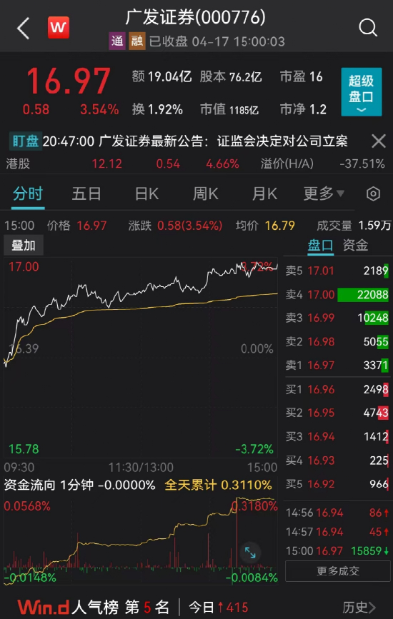 截至4月17日收盘,广发证券股价为16.97元/股,当日涨幅3.54%,总市值1185亿元。