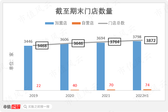 截至2022年上半年末,公司国内门店数量3872家,其中3798家为加盟店,占门店总数的98%,自营店数量仅74家。