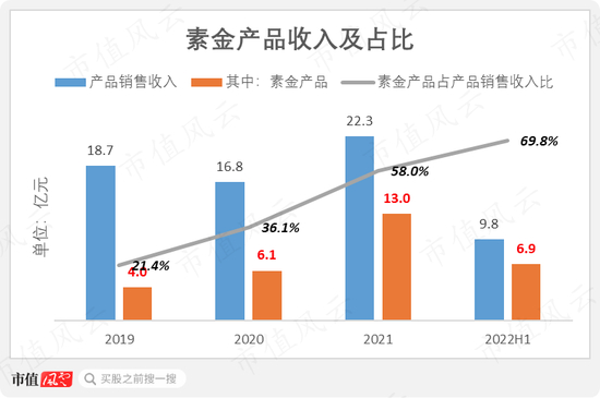 公司的产品销售中,素金产品的收入占比不断提升,从2019年的21%增至2021年的58%,2022年上半年为70%。