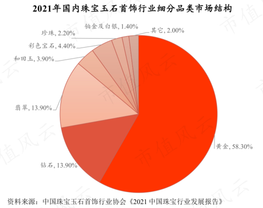 我国是全球第一大黄金消费市场。长期以来,黄金类在我国珠宝产业中占据最大的份额,2021年约58%。