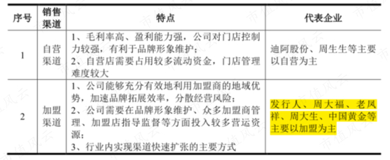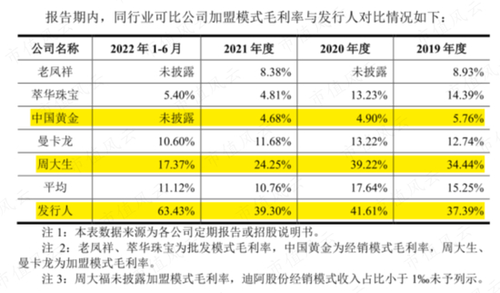 公司在招股书中称,同行业上市公司中,周大生、中国黄金也向加盟商收取品牌使用费。