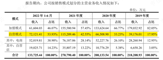 2019-2021年,加盟店的营收占比从82%下滑至58%;同期,自营店的营收占比从18%提升至43%。