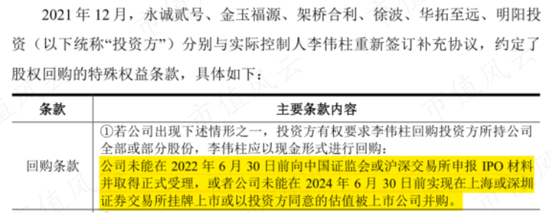 2021年12月,李伟柱与包括多家私募投资基金股东在内、合计持股3.91%的外部股东签订了对赌协议。