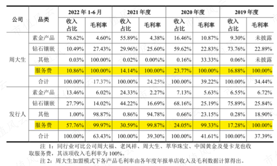 其中,产品销售指公司向加盟商批发销售黄金珠宝首饰;服务费则再细分为“品牌使用费”和“特许经营费”两项。