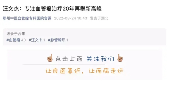 鄂州中医血管瘤专科医院官方公众号曾于2022年8月发布一篇文章,在其中介绍了汪文杰的相关情况。