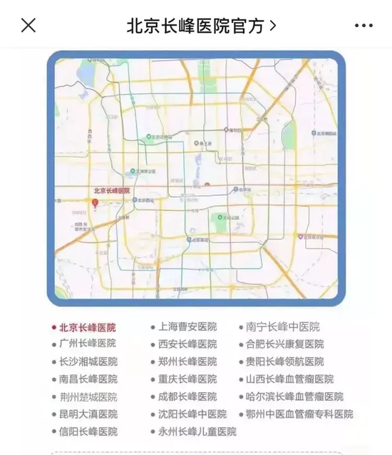 北京长峰医院官方公众号显示,该医院为首家血管瘤领域的新三板挂牌企业,且在上海、南宁、广州、西安等地开设20家连锁医院。
